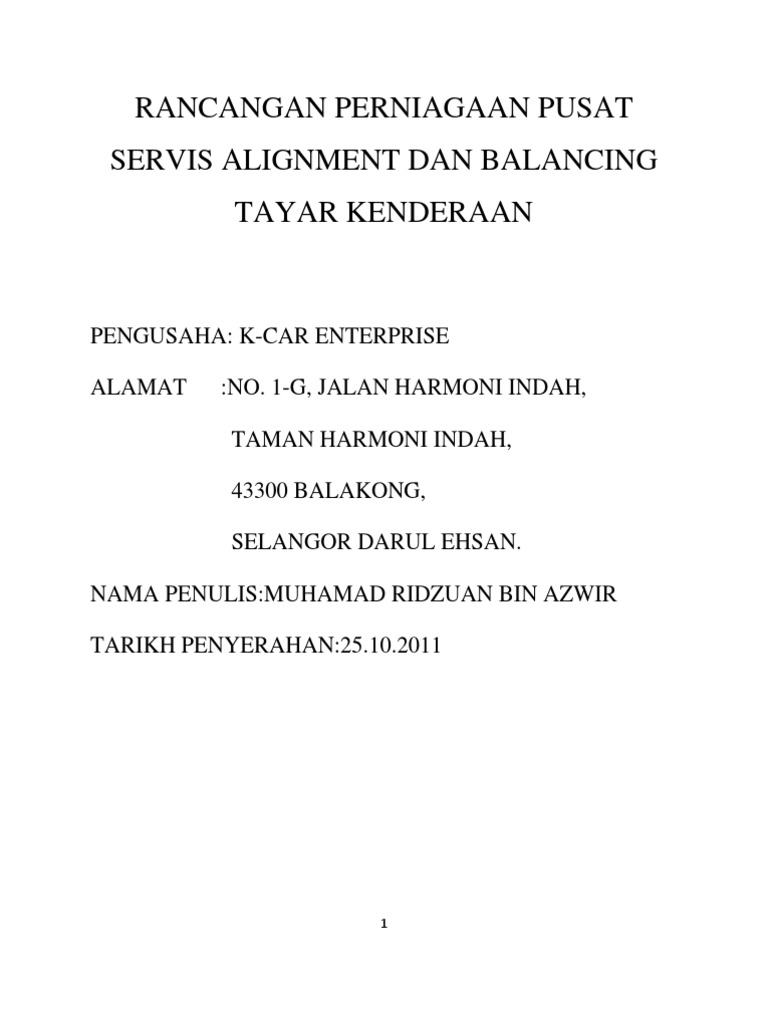 Rancangan Perniagaan Pusat Servis Alignment Dan Balancing Tayar Kenderaan